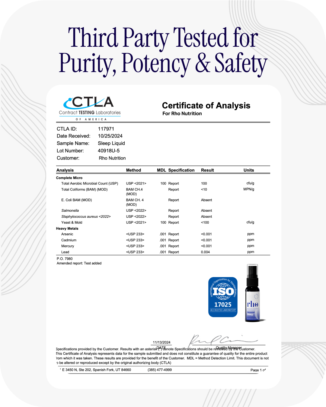 Yes, at Rho Nutrition every single product undergoes a rigorous quality control process ensuring we are setting the industry standard for quality and safety. Every step of the manufacturing process is carefully documented, tested and done in a cGMP, allergen free facility. Every product undergoes a pre production  third party test for purity, identity, and potency and an additional test prior to shipment.