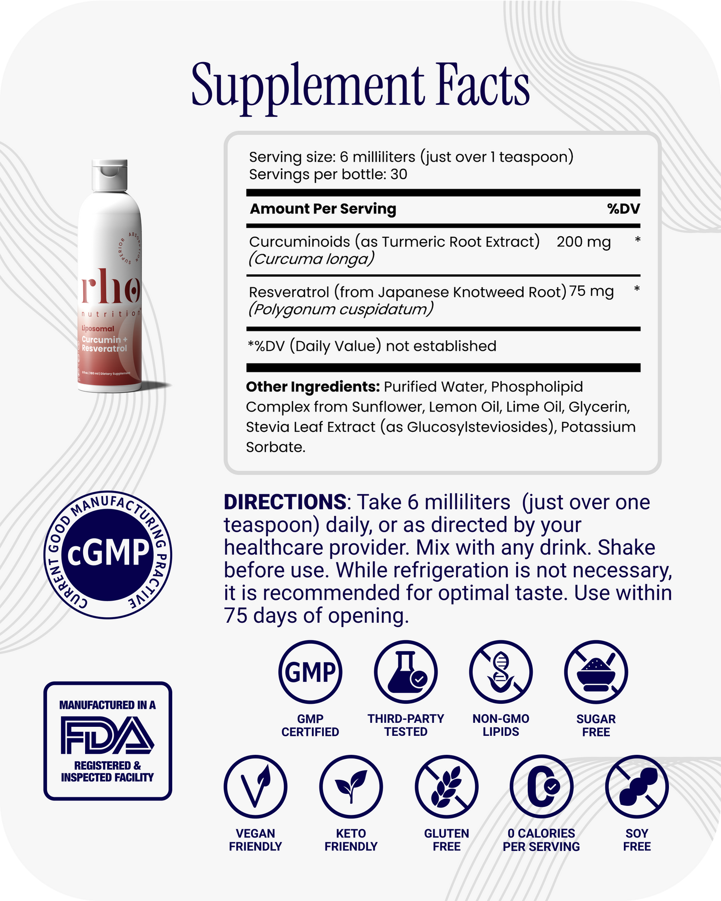 You can take Rho Curcumin + Resveratrol anytime of day. The recommended daily dose is 6ml, equivalent to just over one teaspoon. You have the flexibility to take it with or without food, directly from the teaspoon, or mixed into any beverage of your choice. You can combine Rho Curcumin + Resveratrol with other Rho products in the same drink for added convenience.