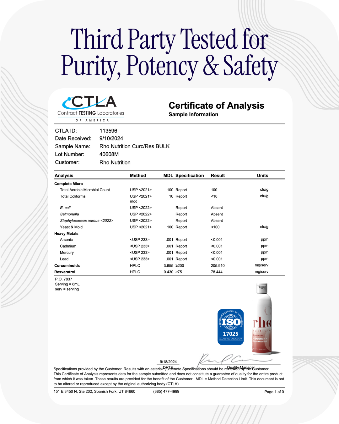 Yes, we source the highest quality, heavy metal free, Curcumin and Resveratrol. Each batch undergoes a thorough triple toxin screening and is independently third party tested by a certified laboratory. You'll find the latest third-party test results right in the listing photos on this page. Our manufacturing facility is allergen-free, cGMP certified, and FDA registered. We maintain the highest standards of manufacturing practices, strictly adhering to cGMP guidelines.